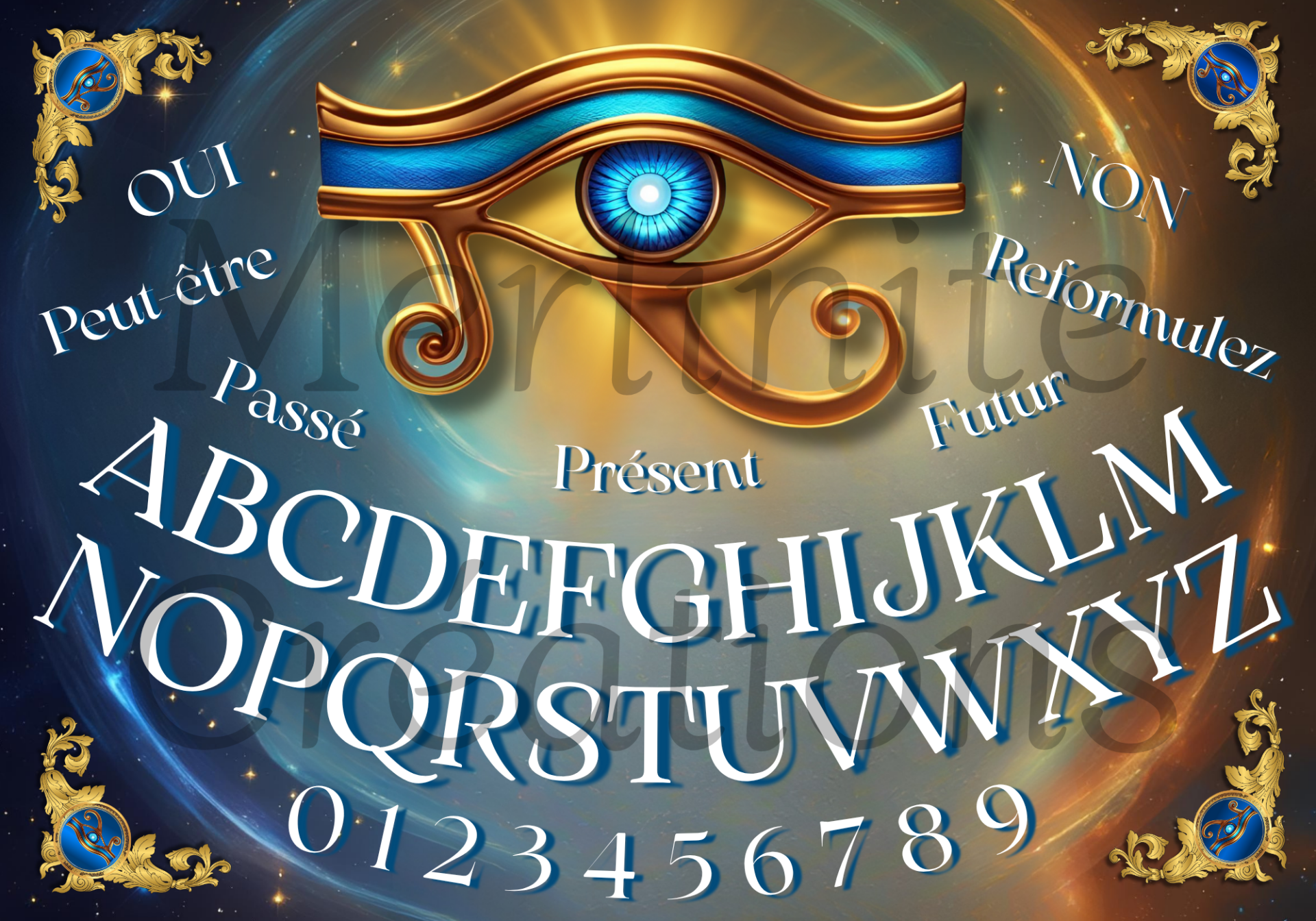 - En central, L'Œil d’Horus : Ancien symbole égyptien de protection, de clairvoyance et de guérison, l’Œil d’Horus agit comme un puissant gardien spirituel. Il favorise la perception intuitive, l’ouverture du troisième œil et la compréhension des messages subtils. Placé au cœur de cette planche, il renforce la précision des réponses en radiesthésie tout en vous enveloppant d’une énergie de sagesse et d’harmonie. Un outil idéal pour explorer les profondeurs de l’invisible avec confiance et lucidité.