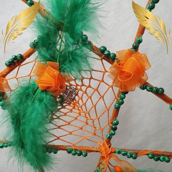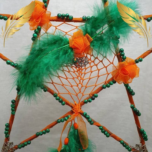 En son centre, un capteur de rêves tissé en fil orange 100 % coton, forme un pentagone naturel, renforçant l’énergie protectrice de la figure sacrée.