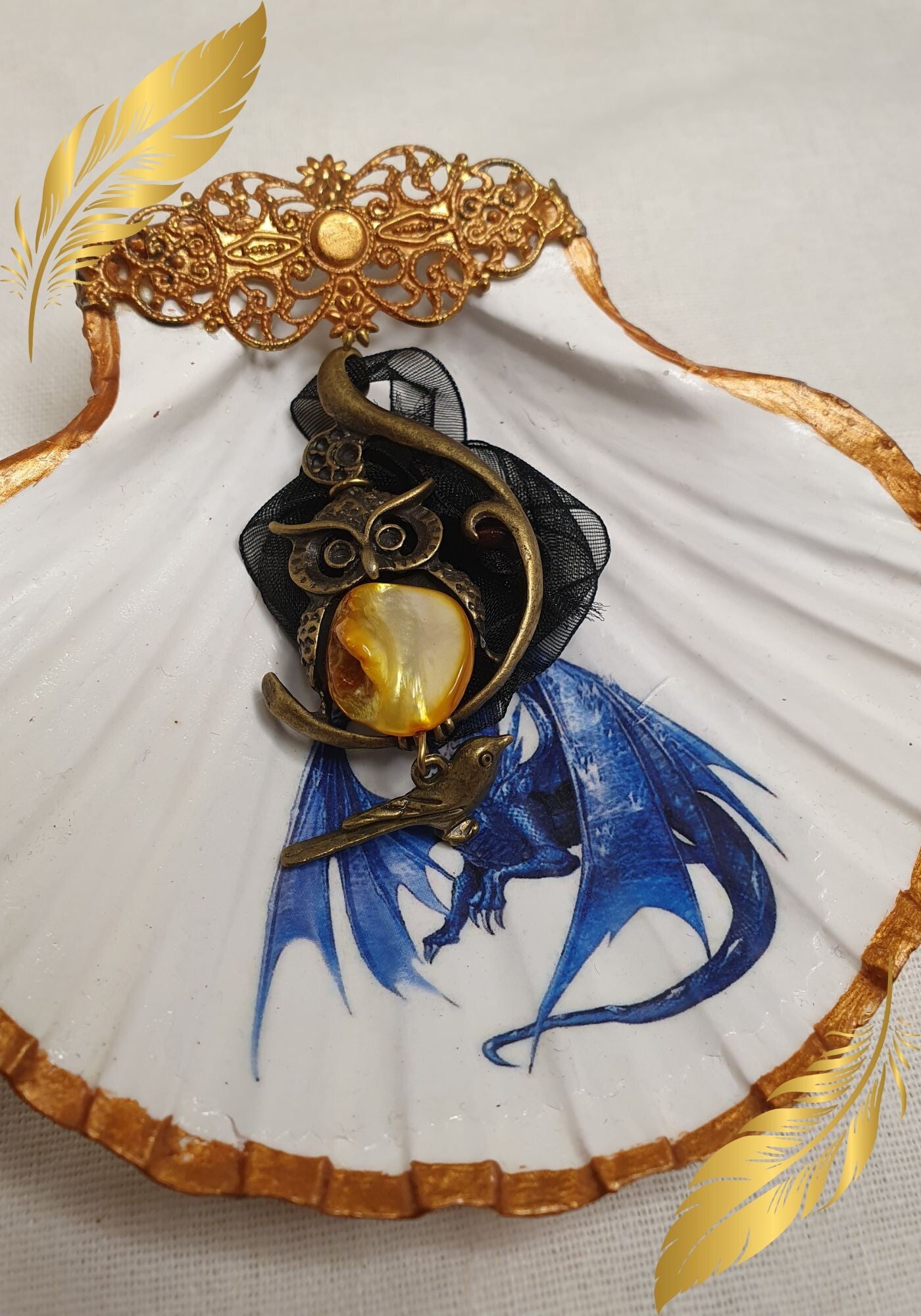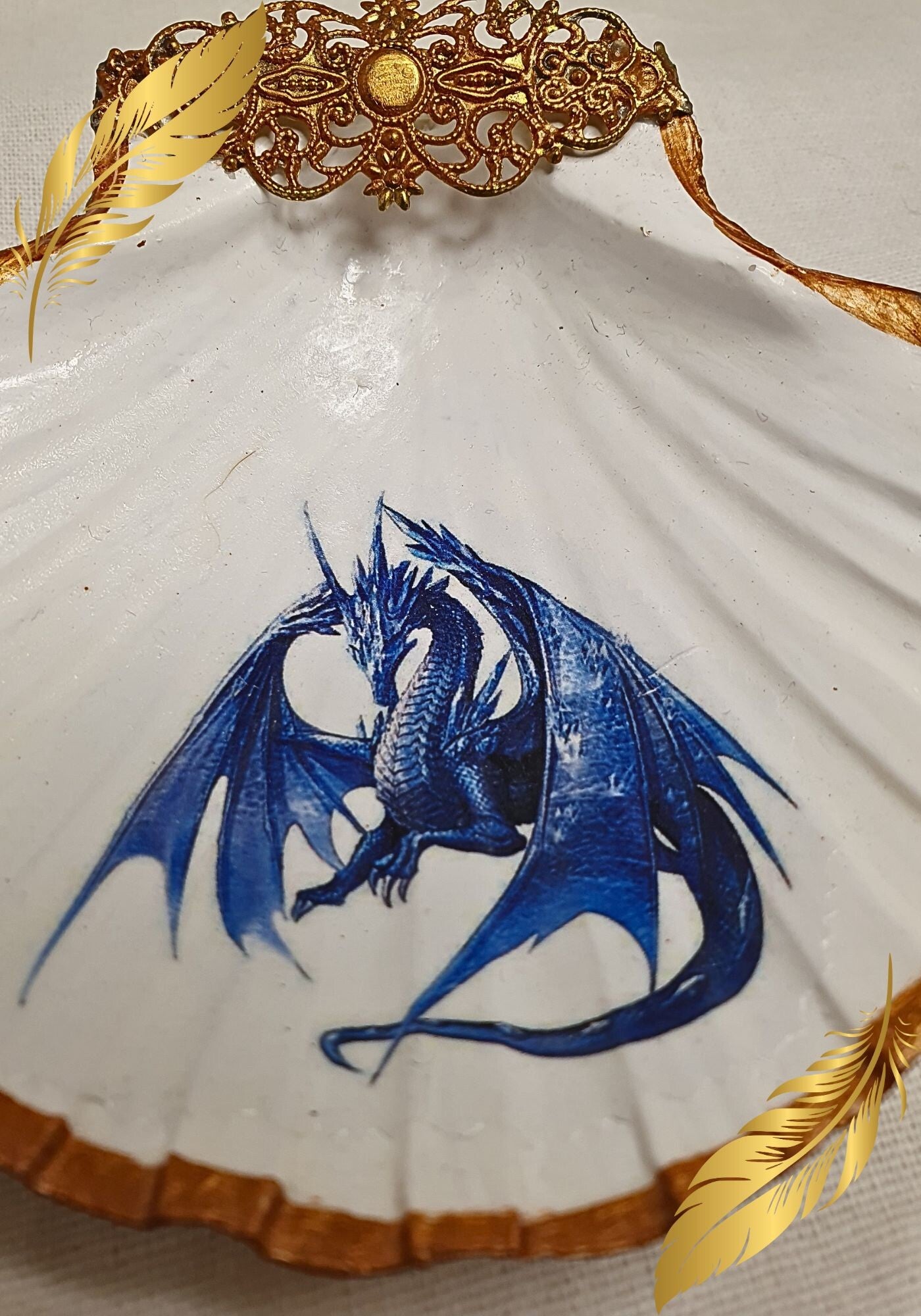 Élégante et unique, cette véritable coquille Saint-Jacques a été revisitée à la main : un dragon bleu, gardien des eaux et symbole de sagesse, de protection et de renouveau, orne son intérieur. Une estampe dorée vient l’illuminer, tandis que le contour est délicatement souligné d’or.