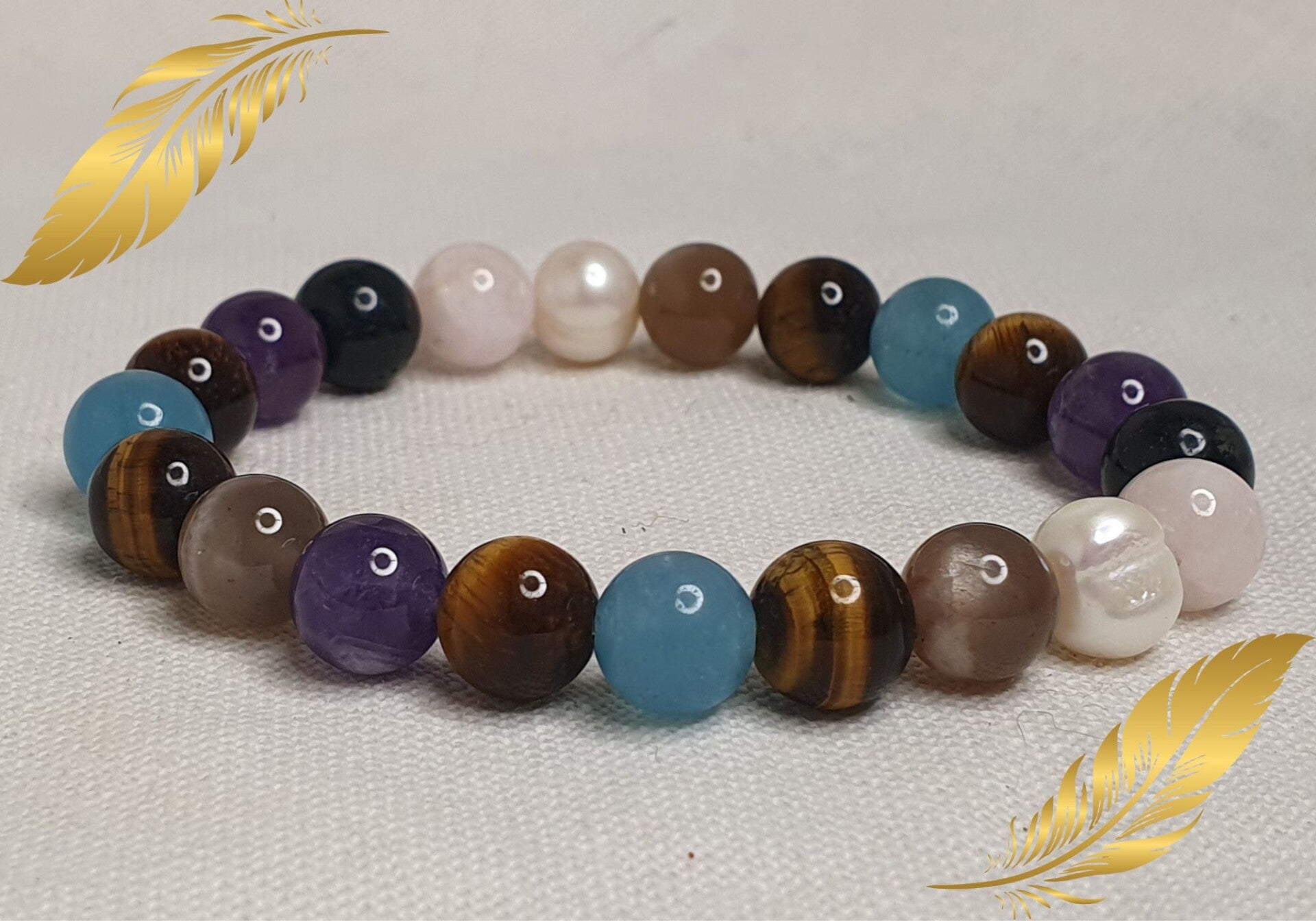 Chaque création est singulière et inspirée : les perles peuvent varier en tailles et en nuances, et j’y intègre parfois des symboles, breloques ou pampilles qui amplifient l’énergie du bijou.