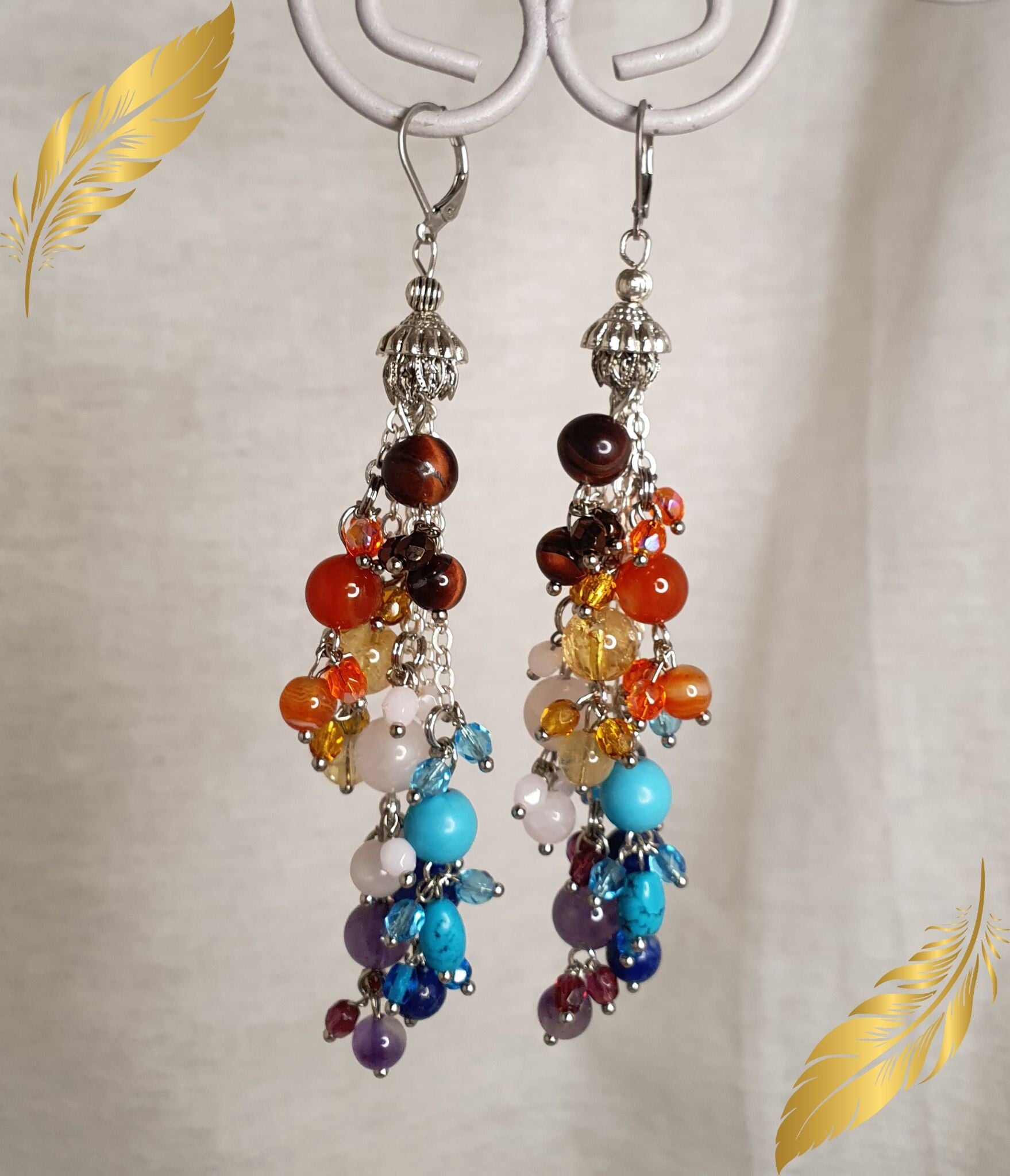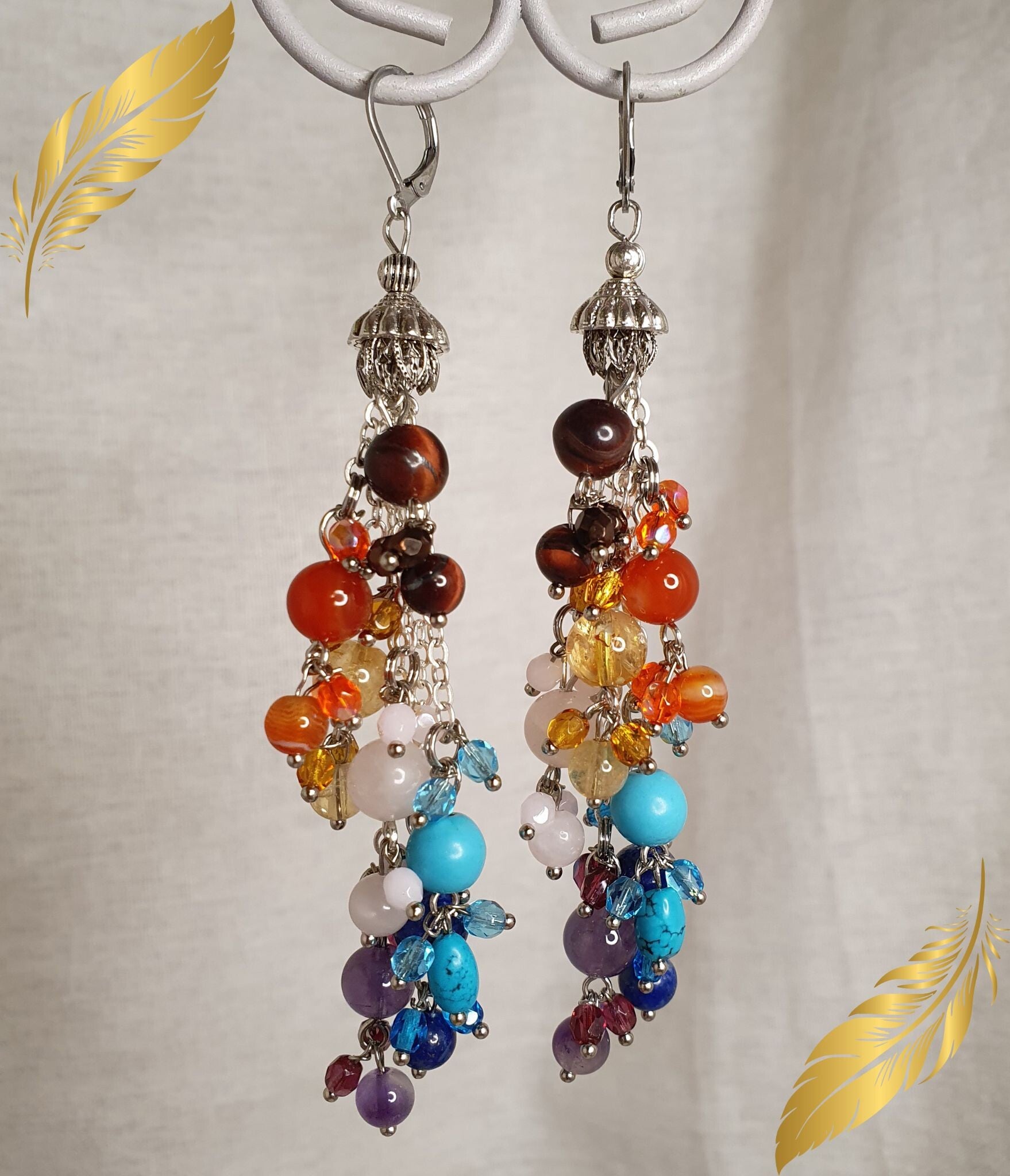 Sublimez votre énergie et votre style avec ces boucles d’oreilles faites main, en laiton argenté et perles en verre de Bohème, composées de pierres naturelles pour équilibrer vos chakras :