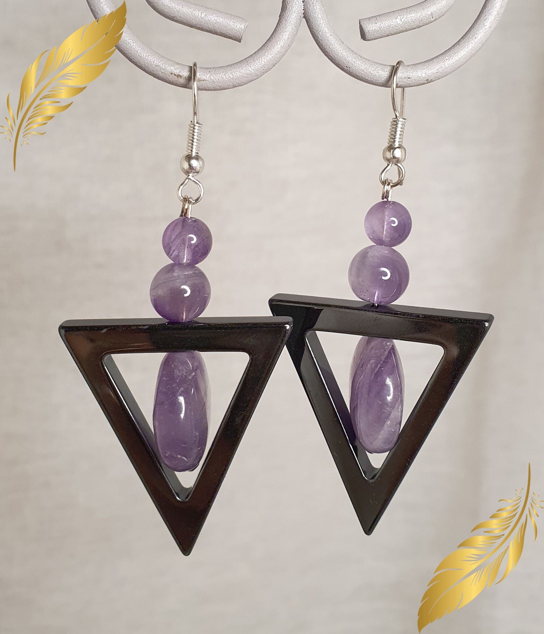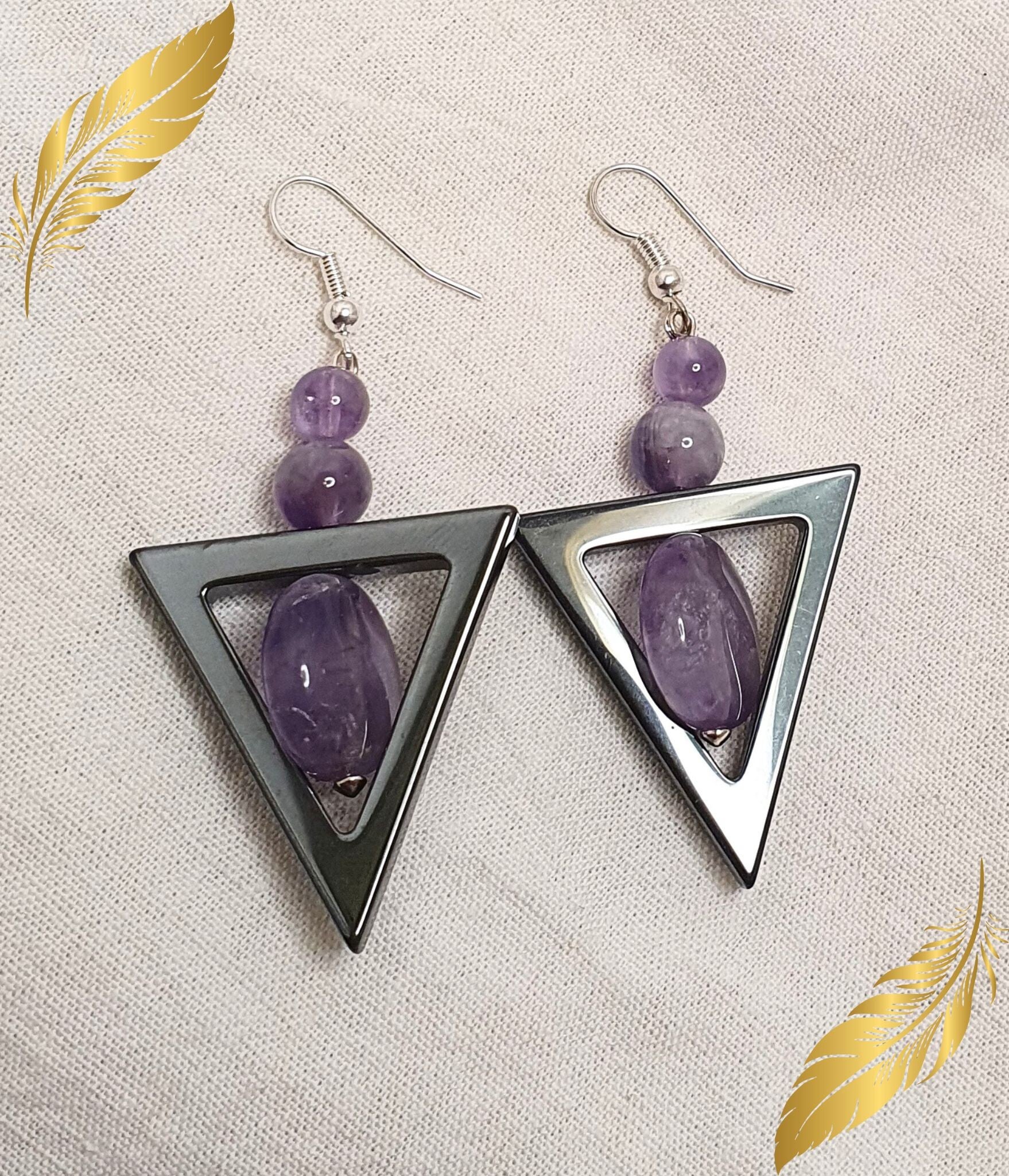 Boucles d’oreilles en argent, Triangle Divin Hématite & Améthyste