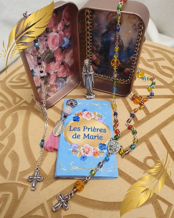 Le livret est orné de perles de quartz rose et d’une médaille de Marie, symbole de tendresse et de lumière