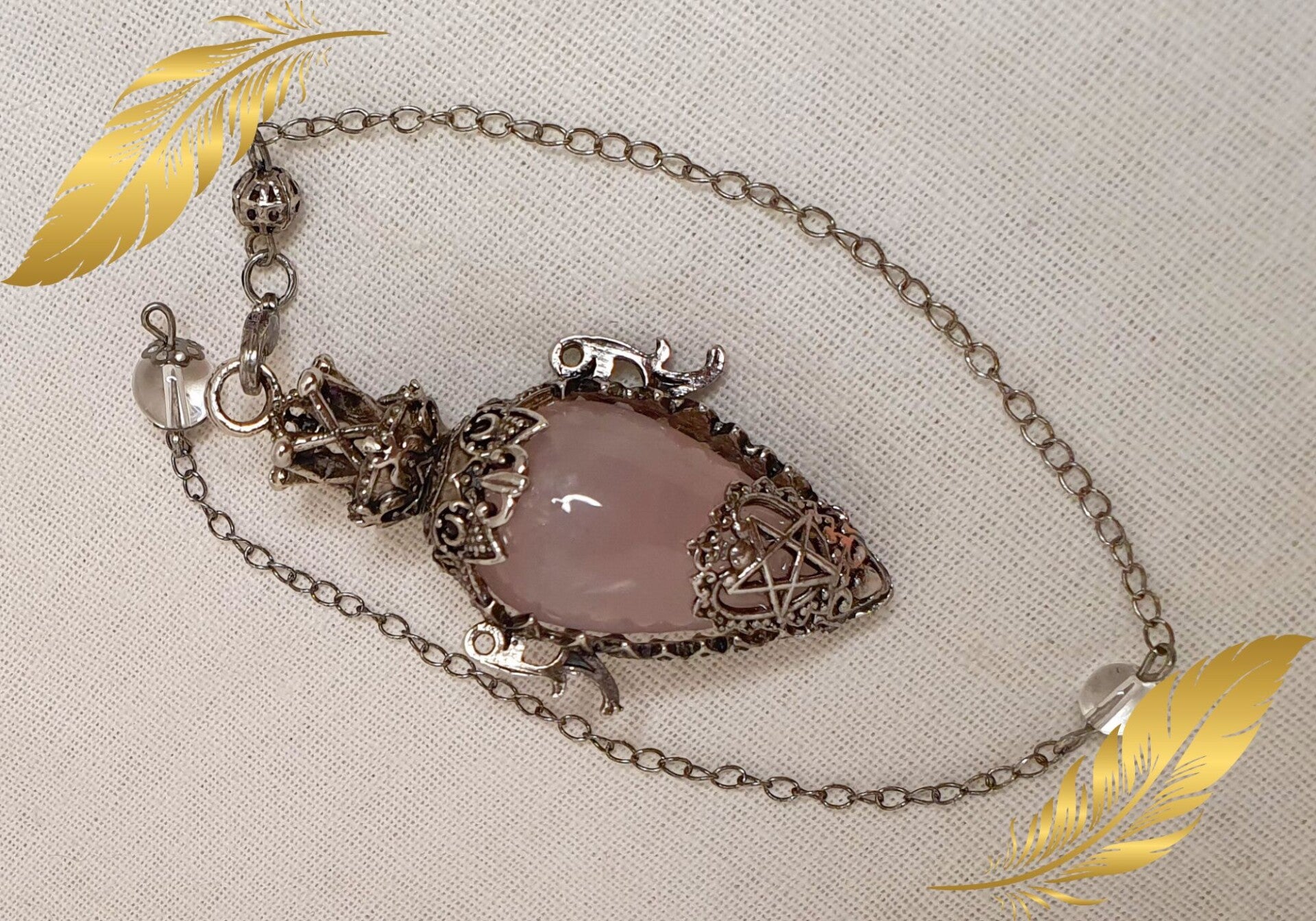 Ce pendule associe la douceur du Quartz Rose à l’élégance d’une finition antique. Symbole d’amour universel et de paix intérieure, le Quartz Rose apaise les émotions, ouvre le cœur et favorise l’équilibre émotionnel au quotidien.