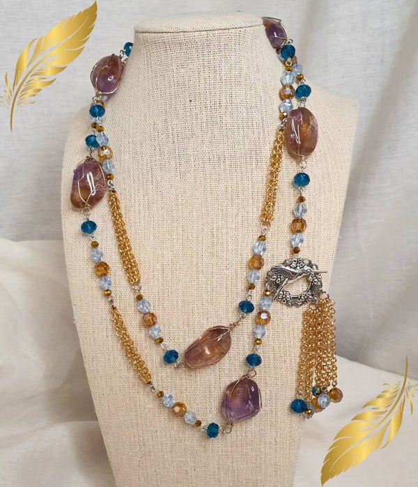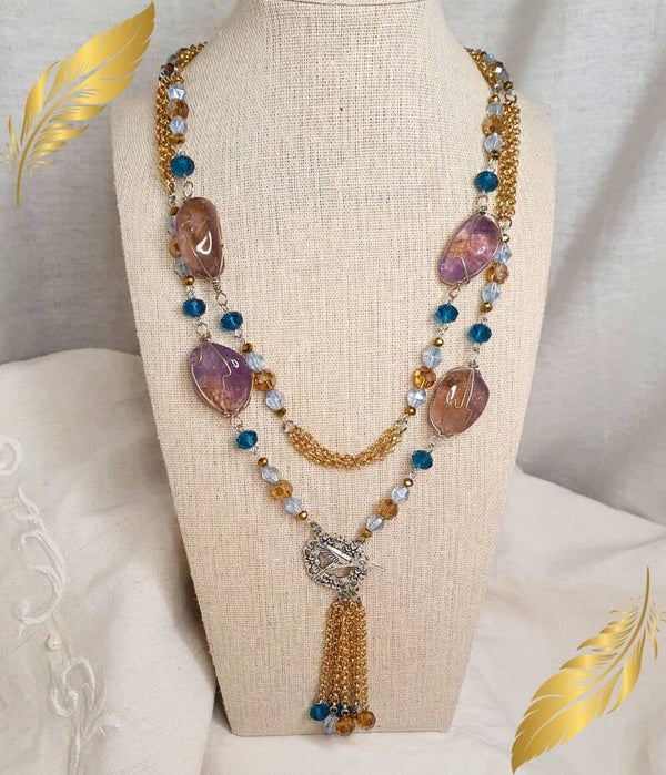 Au centre, brille une splendide Amétrine naturelle, fusion magique d’Améthyste et de Citrine. Cette pierre rare unit sagesse spirituelle et joie créatrice, pour calmer le mental tout en apportant énergie et vitalité. Autour, des perles de verre aux nuances douces et lumineuses viennent compléter le sautoir, créant un bijou harmonieux et poétique qui accompagne vos moments de recentrage et de sérénité.