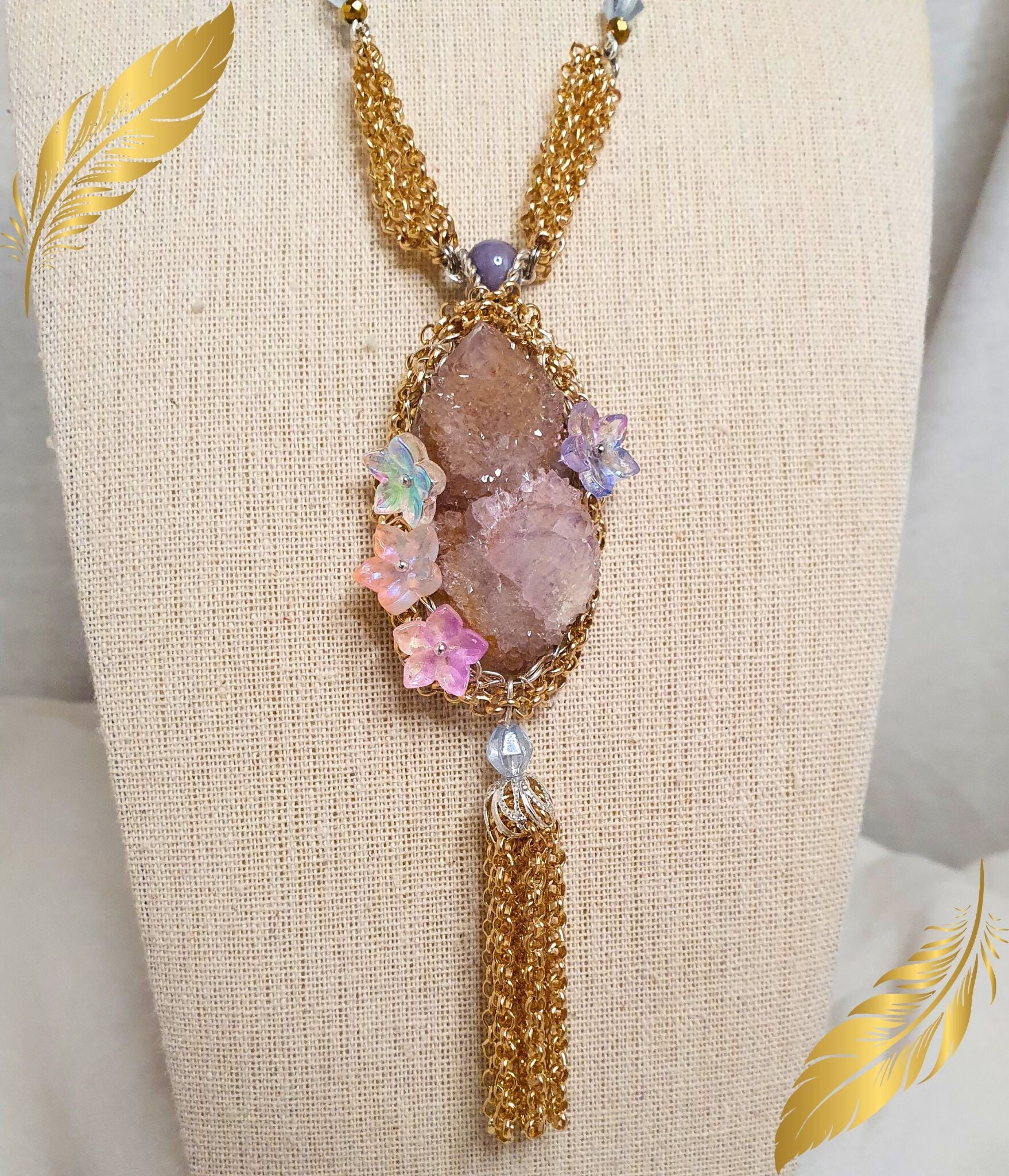 Laissez-vous envelopper par l’énergie douce de ce collier unique, où une splendide Améthyste cactus occupe une place centrale.