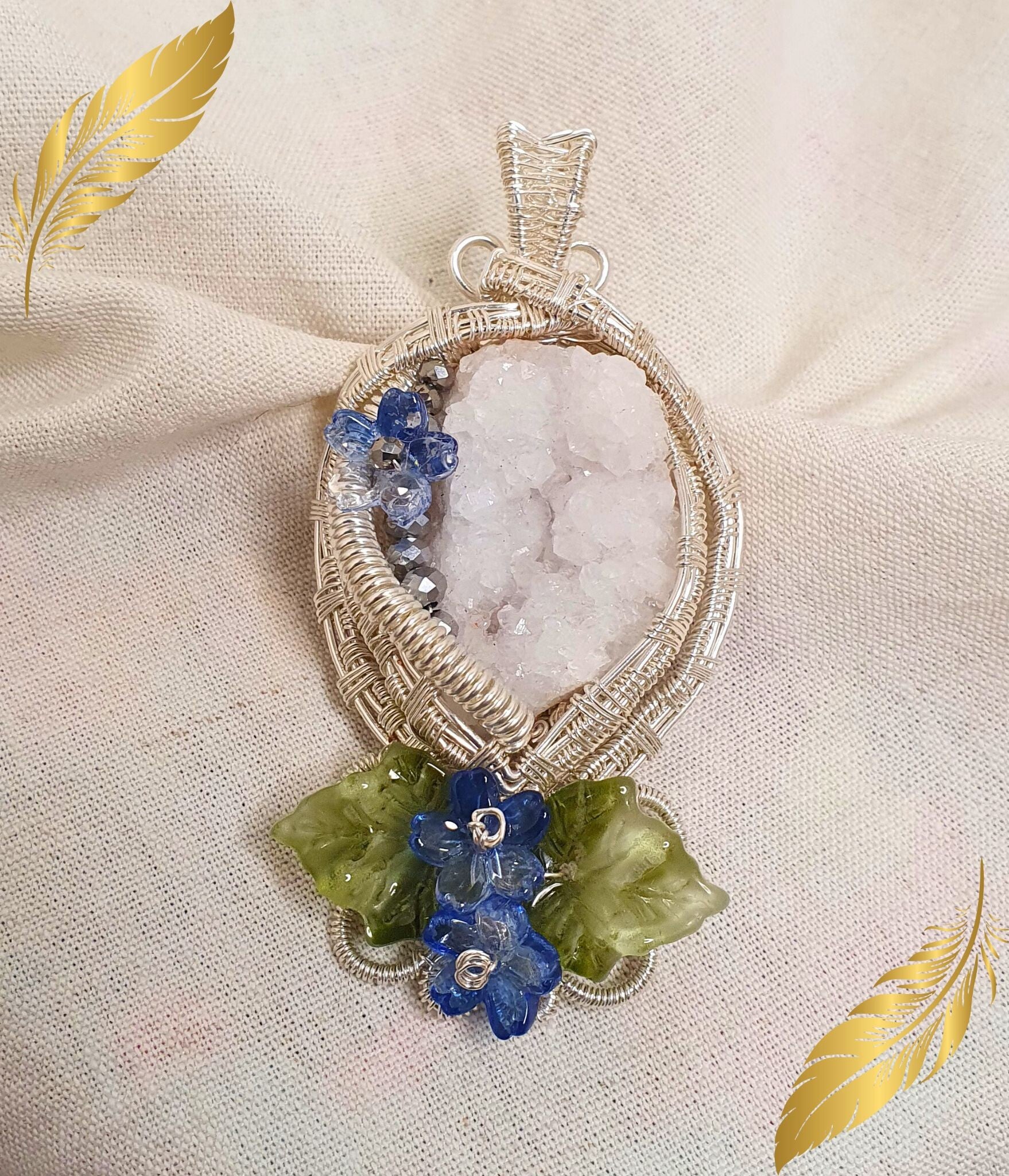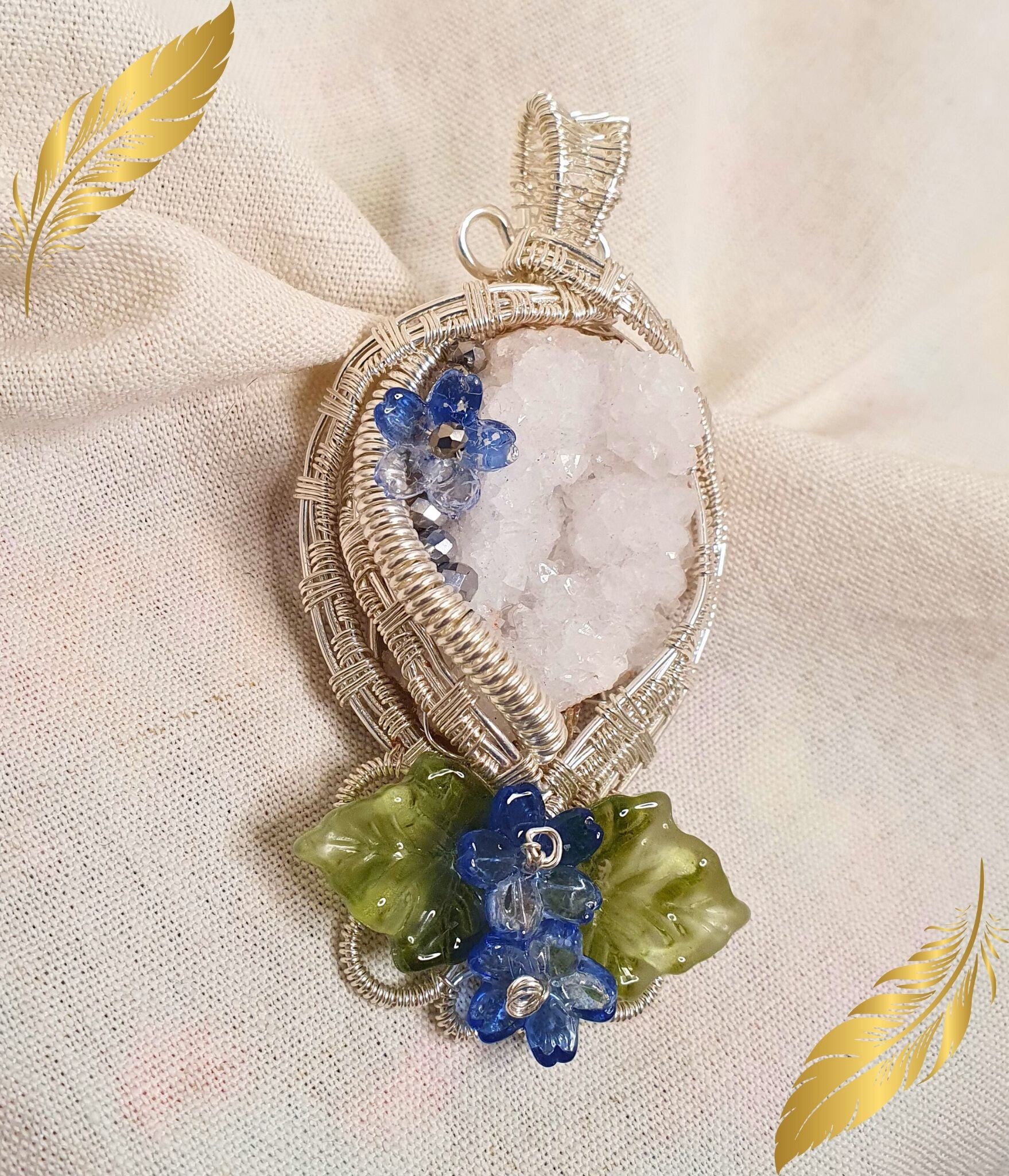 Au centre du pendentif, une druse de quartz blanc naturel capte et diffuse la lumière grâce à ses multiples cristaux.