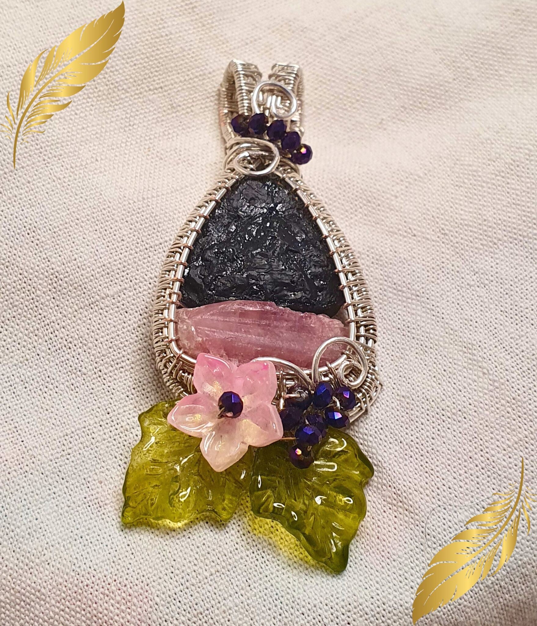 Une petite fleur en verre rose symbolise la tendresse et l’affection, tandis que les feuilles en verre vert évoquent la croissance, le renouveau et la connexion à la nature. De subtiles perles de verre complètent l’ensemble, apportant légèreté, élégance et poésie au pendentif.